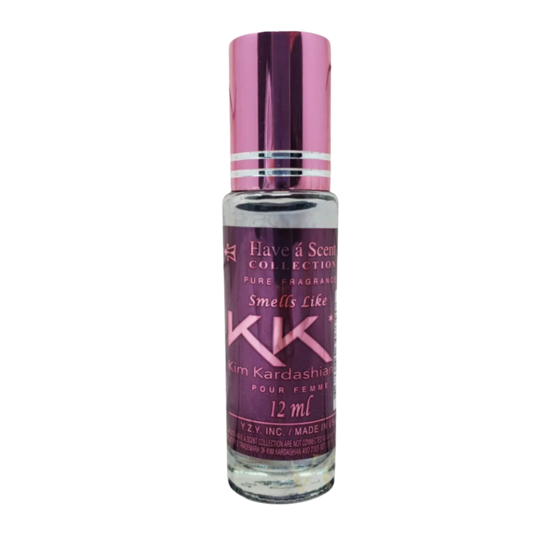 Travel size perfume oil in a 12 ML rollerball bottle. Smells like Kim Kardashian.