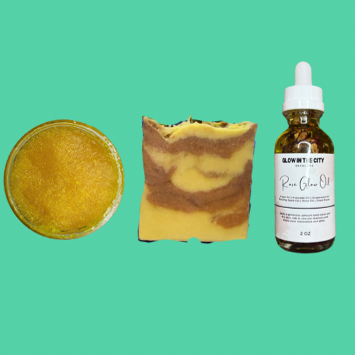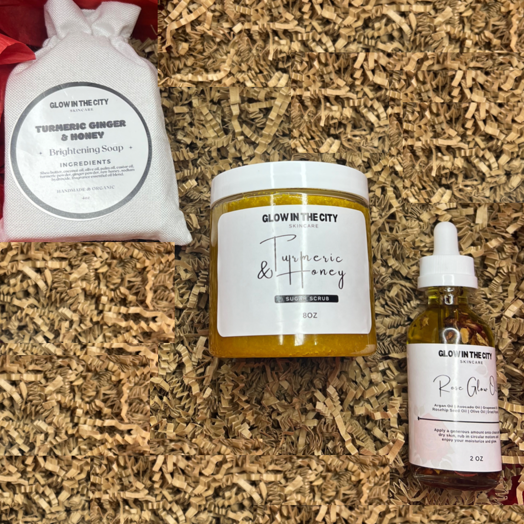 This amazing trio is for people who want to focus solely on brightening dark spots and acne scars, reducing hyperpigmentation, and desires an even skin tone. With the turmeric ginger and honey soap as your cleanser, the turmeric and honey sugar scrub as your gentle exfoliant followed by your rose glow oil you have the perfect combination for evening your skin, brightening your skin and leaving a smooth radiant glow.